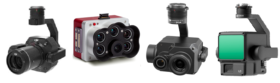 Fig.2: Esempi di sensori commerciali per ogni tipologia di sensore. Da sinistra: RGB, multispettrale, termico, LiDAR.