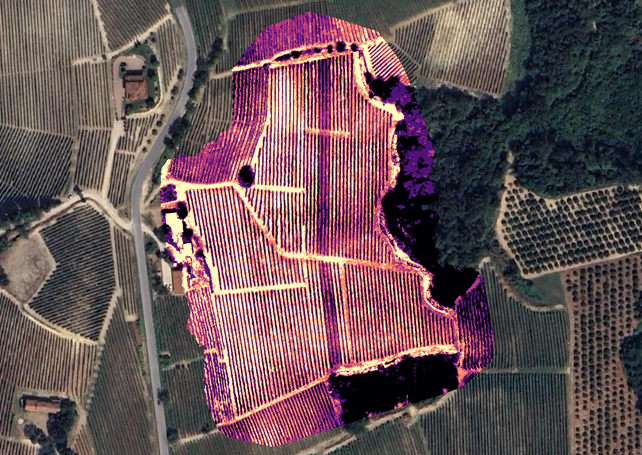 I sensori termici rilevano variazioni di temperatura della chioma o del suolo, misurando la temperatura superficiale. Questo sensore nasce con lo scopo di monitorare l’efficienza degli impianti di irrigazione ma può essere usato efficacemente per individuare aree sottoposte a stress idrico (le foglie in stress tendono a chiudere gli stomi e ridurre l’evapotraspirazione, aumentando la temperatura superficiale) e per la valutazione di danni da gelo/colpi di calore. I dati raccolti dal sensore si possono tradurre in una mappa termica (Figura 4) che permette di analizzare le aree caratterizzare da stress termici.
